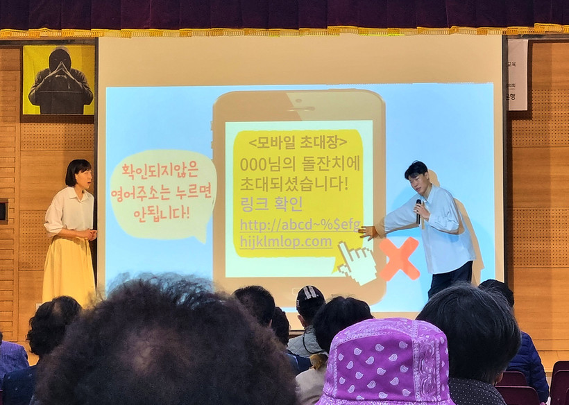 공연 후반부에는 ▲출처를 모르는 인터넷 주소(URL)를 절대 클릭 하지 말 것 ▲보이스피싱이 의심되면 경찰에 신고할 것 ▲지인으로부터 개인정보를 요구하는 문자를 받거나 자녀납치 전화를 받으면 본인에게 반드시 전화해 확인할 것 등 예방 요령을 어르신들이 숙지할 수 있도록 전달하고 퀴즈를 통해 강조했다.