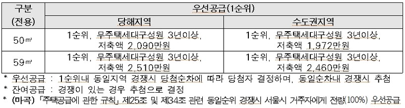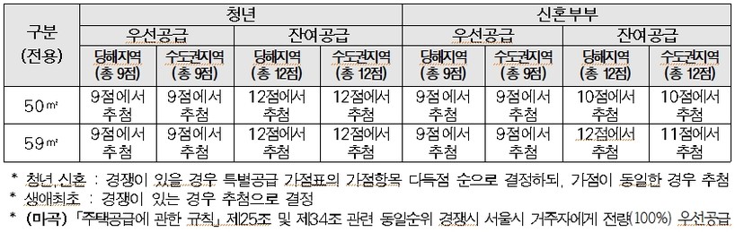 특별공급의 경우 청년 유형은 ▲ 우선공급 9점 ▲ 잔여공급 12점 등 모든 면적 및 지역에서 가점 만점자 추첨으로 당첨자를 선정했다. 신혼부부 유형은 ▲ 전용 50㎡=우선공급 9점, 잔여공급 10점(전 지역) ▲ 전용 59㎡=우선공급 9점, 잔여공급 12점(당해), 11점(수도권)에서 추첨했다. 생애최초 유형은 전원 추첨으로 당첨자를 선정했다.