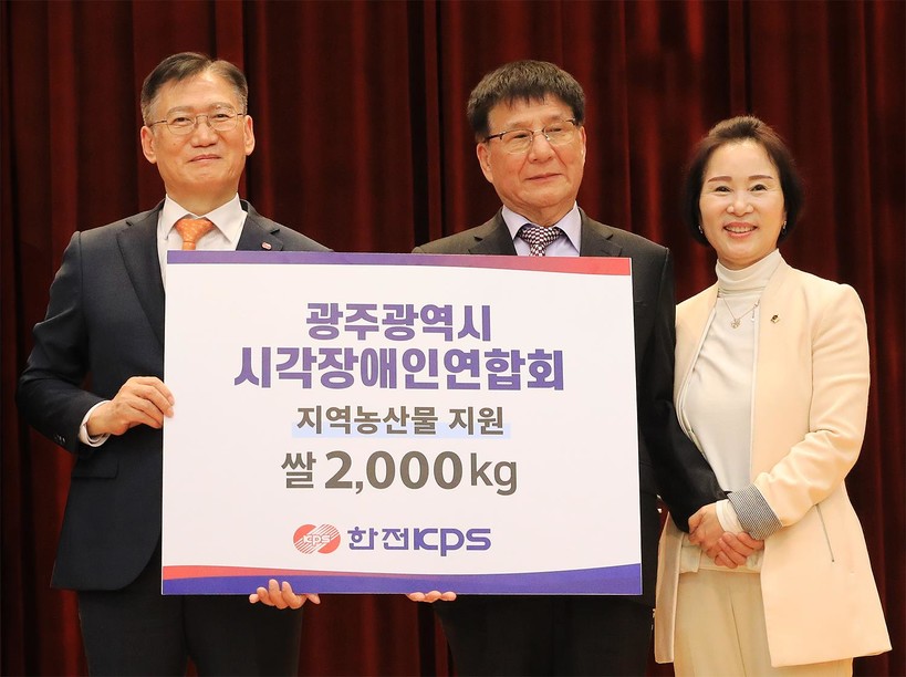 | ▲ 한전KPS 김홍연 사장(왼쪽), 광주광역시 시각장애인연합회장 최삼기 연합회장(가운데), 김용임 광주시의원(오른쪽)이 참석한 가운데 쌀 전달식을 개최하고 기념촬영을 하고 있다. (사진=한전KPS) |
