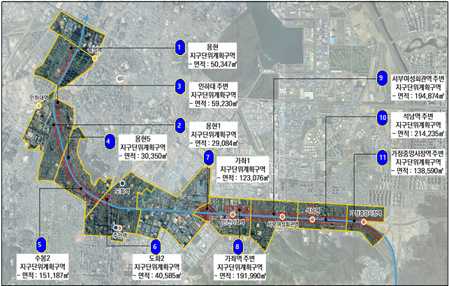지난 2020년 12월 고시된 11개 지구단위계획은 미추홀구 용현동에서 서구 가정동까지 인천대로 주변 직접 영향권(50m) 이내의 122만㎡로, 축구장(7,140㎡) 170여 개에 달하는 규모다.