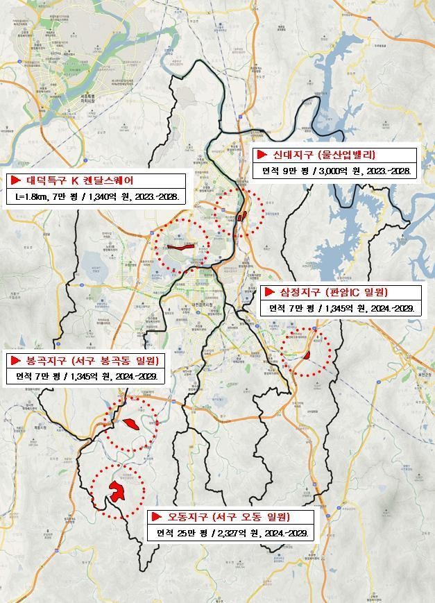 이번 신규 산업단지 예정지는 ▲동구 판암IC 일원 삼정지구(218천m2, 7만 평), ▲서구 오동 지구(824천m2, 25만 평)와 ▲봉곡 지구(332천m2, 10만 평), ▲대덕구 신대지구(291천m2, 9만 평), ▲유성구 가정로 일원 대덕특구 K-켄달스퀘어(L=1.8km, 226천m2, 7만 평)로 총 5개소이다.