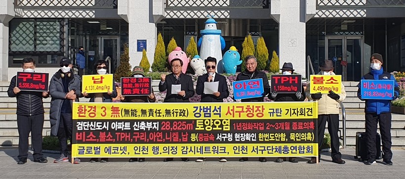 [일요주간 = 김성환 기자] 환경단체 글로벌 에코넷과 인천 행·의정 감시네트워크, 인천 서구단체 총연합회, 서구주민들이 인천 서구청과 강범석 서구청장의 사퇴를 촉구했다.