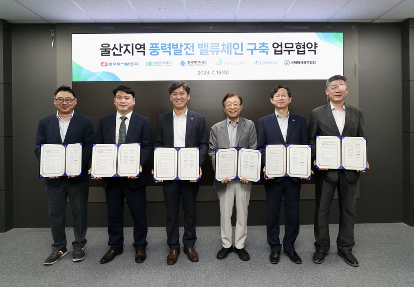 [일요주간=김영란 기자] 한국동서발전(주)(사장 김영문)는 울산대학교·한국에너지공단·울산테크노파크·유니슨·국제해상풍력협회와 ‘울산지역 풍력발전 밸류체인 구축 업무협약’을 18일(화) 오후 2시 울산 중구 본사에서 체결했다.