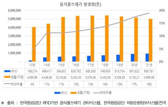 음식물쓰레기 원천 감량을 위해 도입된 RFID 종량제는 2013년 본격 시행한 후 도입 지자체가 꾸준히 증가하였다. 현재 전국 176개 지자체가 제도를 도입하여 761만 세대가 이용하고 있으며, 이는 공동주택 기준 55%, 전체 세대 기준 35%에 해당하는 수치이다.