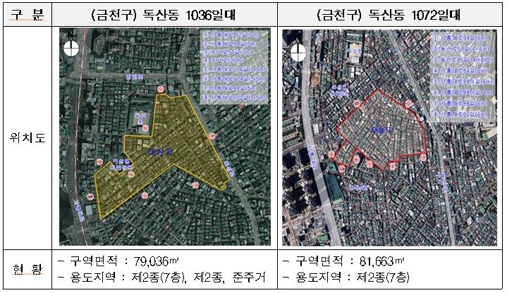 특히, 독산동 1036일대, 독산동 1072일대와 같이 인접한 후보지가 있는 곳은, 정비계획 수립시 지역의 통합 마스터플랜 계획을 통하여 도로 등 기반시설을 연계하여 정비계획을 수립할 예정이다.