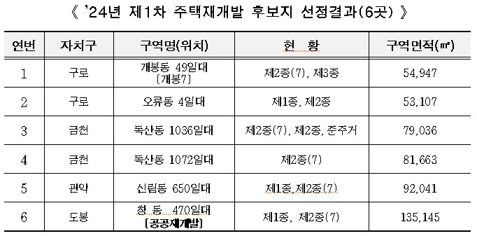 ▲ ’24년 제1차 주택재개발 후보지 선정결과(6곳) (표=서울시) |