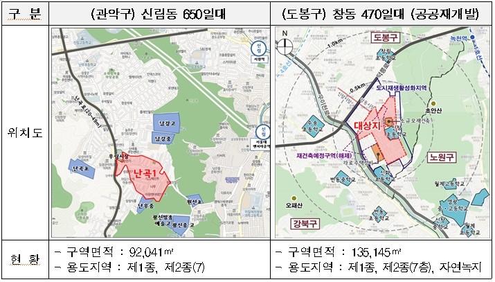 선정된 신속통합기획 재개발 대상지는 노후도 및 반지하주택 비율 등 기반시설이 열악하여 주거환경개선이 필요한 지역이며, 주민동의율이 높고 반대동의율이 거의 없는 등 주민들의 추진의지가 높아 올해 첫 신통기획 재개발 후보지로 선정되었다.