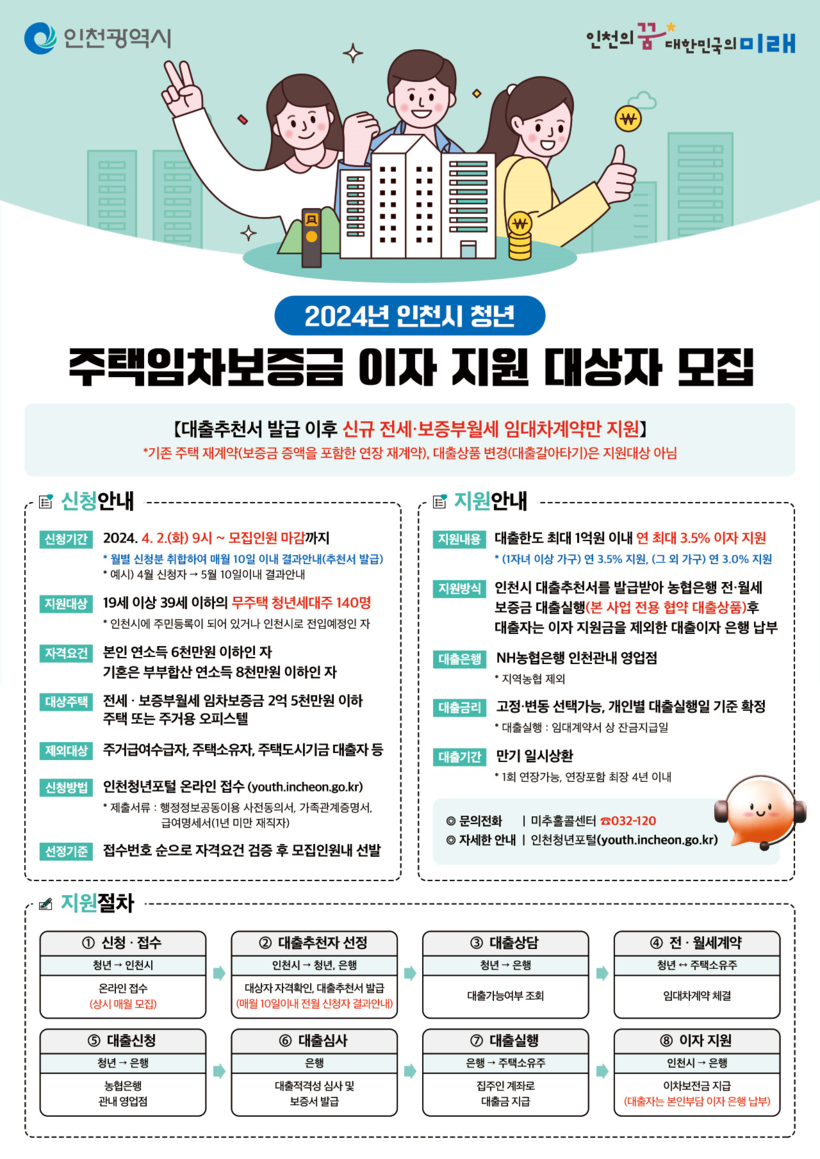 인천시는 한국주택금융공사, NH농협은행 인천본부와 2023년 업무협약을 체결하고 협약대출상품을 출시해 연 2.0% 이자 지원(1인당 월평균 14만 원)을 추진해 왔다. 그러나 계속되는 고금리와 물가상승 등으로 청년의 경제적 어려움이 가중되고 있어 올해부터 이자 지원을 연 최대 3.5%로 대폭 확대한다.