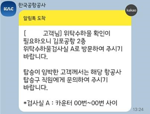 ▲ 위탁수하물 개봉검색 대상 승객, 카카오톡 알림톡 수신(사진=한국공항공사)