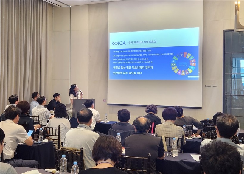 | ▲ 한국서부발전은 27일 한국국제협력단, 한국지역난방공사, 한국가스공사와 국내 중소기업 해외판로 진출 지원 공동 협약을 체결했다. 사진은 지난 8월 25일 경기 광명 라까사호텔에서 열린 ‘동반성장 윈윈데이’ 워크숍에서 한국국제협력단 관계자가 발표하는 모습 (사진=서부발전) |