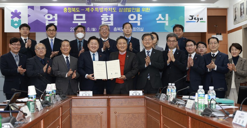 [일요주간=김영란 기자] 충청북도(도지사 김영환)와 제주특별자치도(도지사 오영훈)는 8일 상호 교류 확대와 상생 발전을 위한 업무협약을 체결했다.