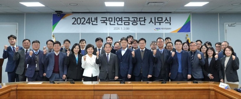 | ▲ `24.1.2.(화) 국민연금공단 본부에서 열린 2024년 시무식을 마치고 김태현 이사장이 임직원들과 함께 기념촬영을 하고 있다. (사진=국민연금공단) |