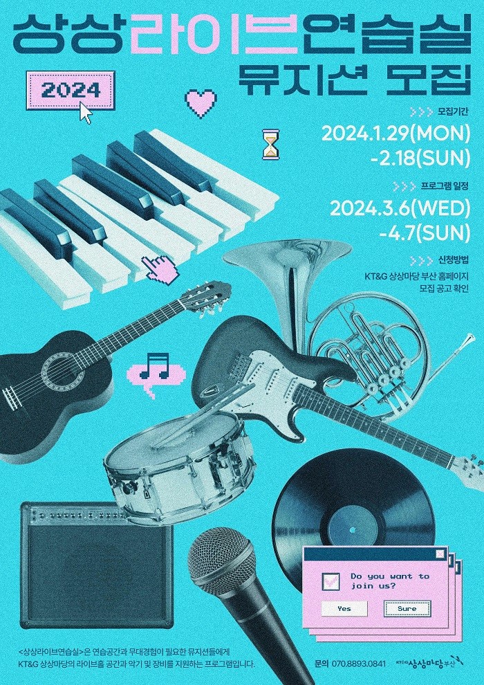 KT&G 상상마당 부산 관계자는 “이번 ‘2024 상상라이브연습실’은 더 많은 신진 뮤지션들의 발굴을 위해 지원 대상을 전국에서 활동중인 뮤지션으로 확대했다”며, “앞으로도 상상마당은 알려지지 않은 실력파 뮤지션들이 대중들 앞에 설 수 있도록 꾸준히 지원할 것”이라고 말했다.
