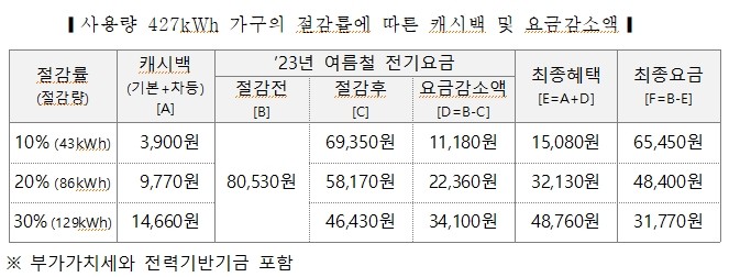 | ▲ 사용량 427kWh 가구의 절감률에 따른 캐시백 및 요금감소액(이미지=한전) |