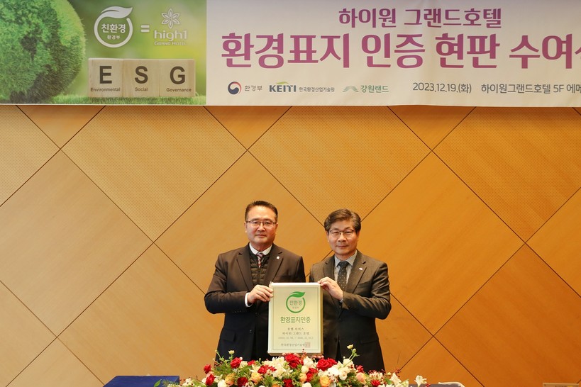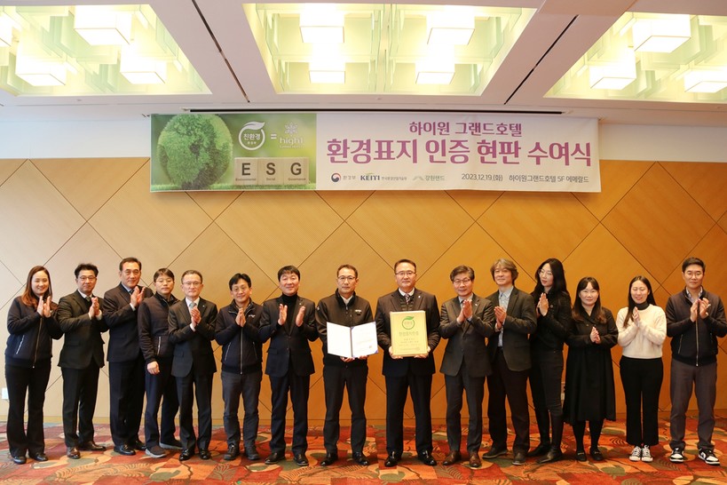 [일요주간=김영란 기자] 강원랜드가 환경부 산하기관 한국환경산업기술원으로부터 ‘호텔 서비스’부문 환경표지 인증서를 취득하며 19일 강원랜드 하이원 그랜드호텔에서 환경표지인증 현판 수여식을 개최했다.