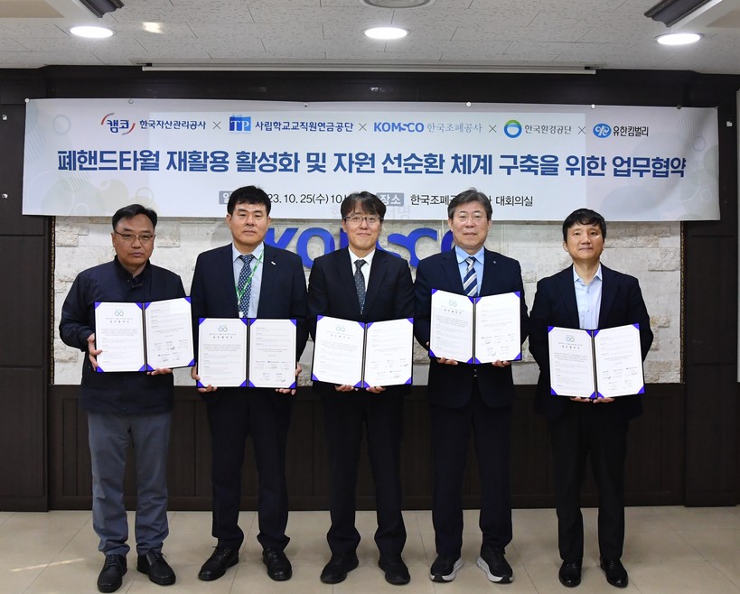 [일요주간=김영란 기자] 한국조폐공사(사장 성창훈, www.komsco.com)는 25일 본사에서 한국자산관리공사, 사학연금공단, 한국환경공단, 유한킴벌리와 ‘폐핸드타월 재활용 활성화 및 자원 선순환 체계 구축’을 위한 업무협약을 체결했다.
