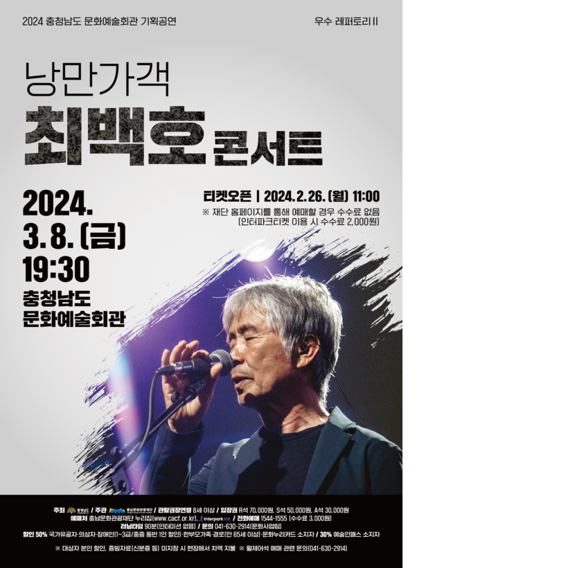 충남도는 다음달 8일 도청 문예회관에서 올해 세 번째 기획공연 ‘낭만가객 최백호 콘서트’를 개최한다고 20일 밝혔다.