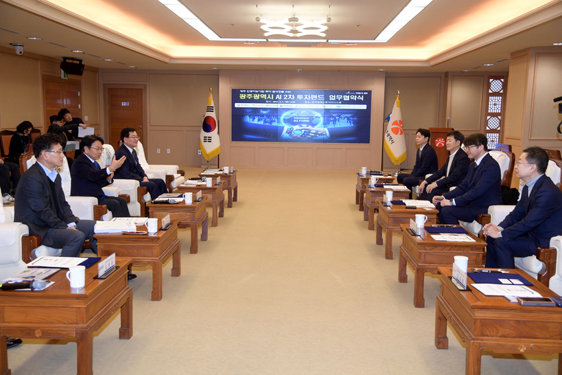 광주광역시(시장 강기정)는 4일 오후 시청 비즈니스룸에서 북구청, 광주은행, 광주테크노파크, 5개 펀드 운용사들과 ‘인공지능(AI) 2차 투자펀드 업무협약’을 체결했다.