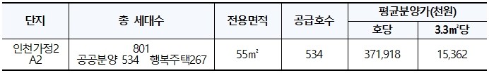 [일요주간=김영란 기자] 한국토지주택공사(LH)는 오는 15일부터 시세보다 저렴한 인천가정2지구 신혼희망타운(공공분양) A2블록 534호에 대한 청약접수를 실시한다고 밝혔다.