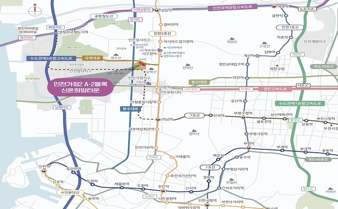 인천가정2 A2 신혼희망타운(공공분양)은 인천지하철 2호선 가정역 및 서구청역과 인접해 있으며 2028년 개통 예정인 서울7호선 연장선을 도보로 이용 할 수 있다.