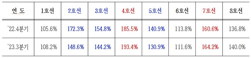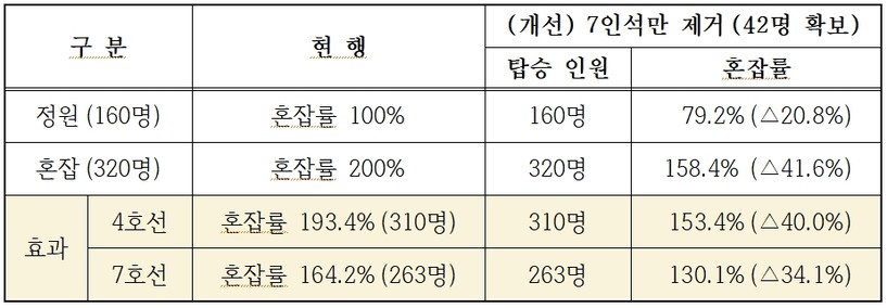 4호선과 7호선은 ‘23년 3분기 기준 최고 혼잡도가 각각 193.4%, 164.2%로 여전히 150%를 초과한다.
