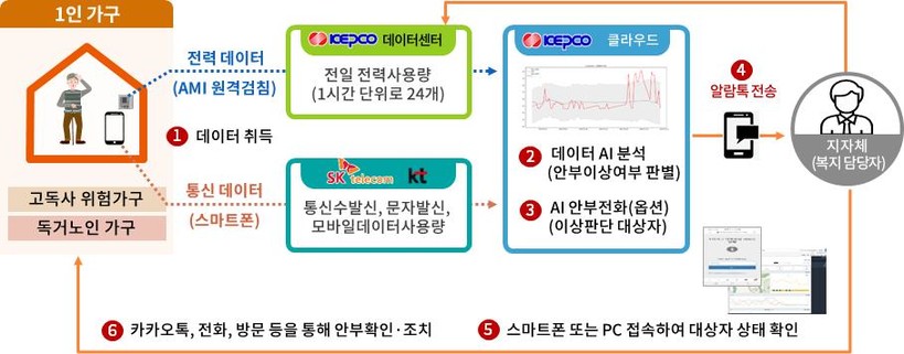 한전과 통신사(SK텔레콤, KT)가 시행 중인 ’1인가구 안부살핌 서비스‘는 가정 내 별도의 기기설치 없이 원격검침계량기(AMI)를 통해 수집된 대상자의 전력사용 데이터와 통신사로부터 수집된 통화 수발신 내역 등의 통신 데이터를 융합 분석하여 대상자의 생활패턴을 파악한 후, 이상 상황이 감지되면 복지 담당 공무원에게 알림 메시지를 발송하는 서비스로 ’24년 4월 기준 32개 기초지자체에 제공 중이며 현재까지 총 11건의 고독사 예방 실적(응급상황 구조 포함)이 있다.