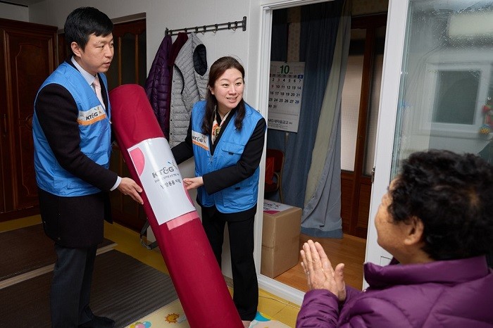 KT&G 임직원들은 지난 5일 서울의 마지막 달동네인 노원구 백사마을의 에너지 취약계층에게 연탄을 직접 전달하는 나눔 행사를 진행하는 한편, 지난 6일 ‘KT&G 상상마당 논산’에서 지역의 소외된 이웃 약 70여 가구에 난방용품을 전달하는 등 전국 각지에서 온정의 손길을 이어가고 있다.