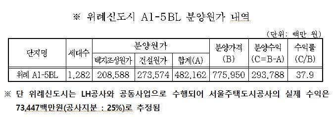 | ▲ 위례신도시 A1-5BL 분양원가 내역(표=SH공사) |