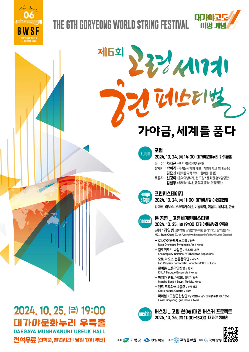 고령문화원(원장 신태운)이 주관하는 제6회 고령 세계 현 페스티벌은 예년보다 규모를 좀 더 확장하여 다채로운 프로그램을 진행할 예정이다. 10월 24일 축제의 시작을 알리는 전야제 프린지스테이지가 오전 11시 대가야시장 야외공연장에서 열리고, 같은 날 오후 2시 대가야문화누리 가야금홀에서 박미경 교수(계명대 명예교수)와 김묘신 교수(종족음악학자)의 발제와 신경아, 김칠도 선생의 토론으로 “고령 세계 현 축제에 거는 기대”와 “중동의 음악 문화” 주제로 포럼이 열린다.