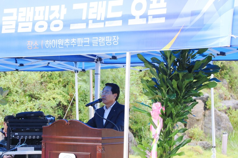 | ▲ 하이원추추파크 글램핑 오픈 기념식에서 격려사를 하고 있는 이삼걸 강원랜드 대표이사 (사진=강원랜드) |