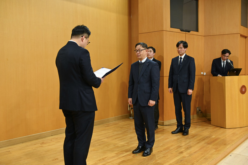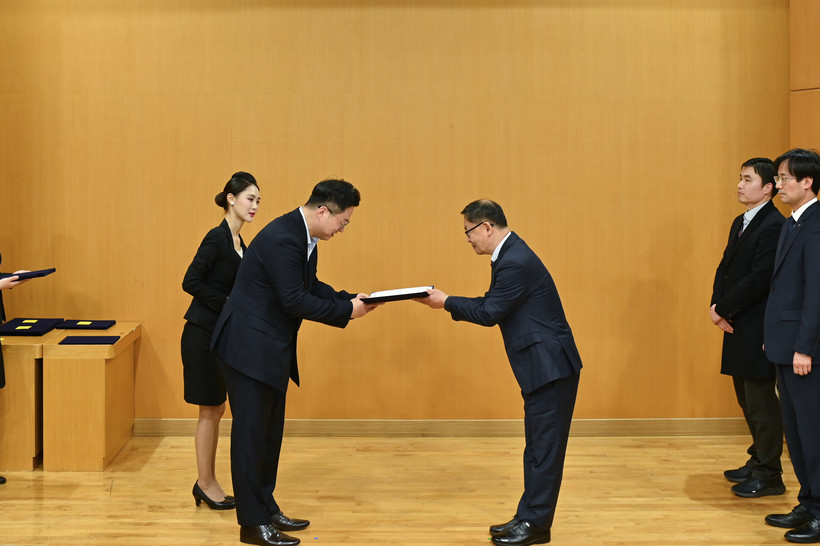 | ▲ 한국석유공사 ESG 경영팀장(오른쪽) 이 한국공공ESG연구원 김민균 원장으로부터 수상을 받고 있다. (사진=한국석유공사) |
