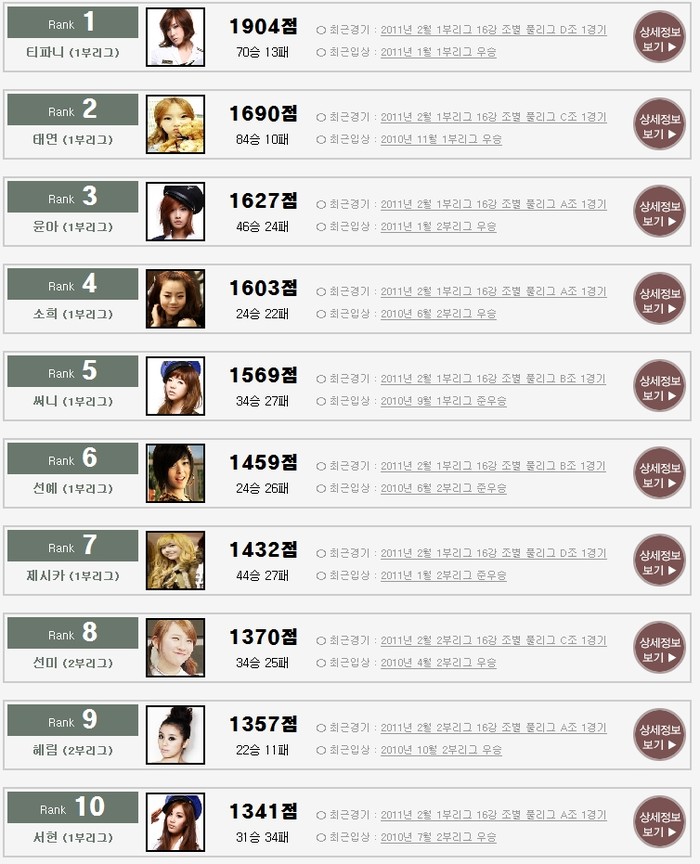 이번 1월 리그에는 1부리그-티파니, 2부리그-윤아, 3부리그-효연, 4부리그-빅토리아, 5부리그-양요섭이 각 치열한 접전 끝에 우승의 영광을 안았다.