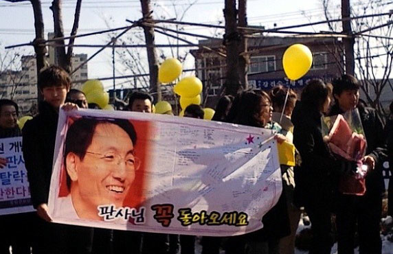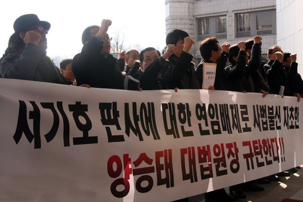 한편 이날 서 판사를 지지하는 사람들이 모여 '국민법관' 호칭을 수여하고 그의 법원 복귀를 바라며 노란 풍선을 하늘로 띄워 보냈다.이 자리에 참석한 '민주사회를 위한 변호사 모임' 소속의 이상갑(44) 변호사는 "서기호 판사의 재임용 탈락은 법원의 재임용 제도 자체에 문제가 있음을 보여줬다"고 지적했다.
