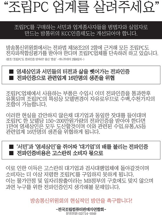 [일요주간=노정금 기자] 지난 20년간 용산 조립PC 업체에서는 학생들과 서민층을 상대로 컴퓨터에 사용되는 부품을 조립해 브랜드 컴퓨터 보다 저렴한 가격으로 조립식PC를 판매해 왔다. 하지만 지난 7일 방송통신위원회(이하 방통위)에서 ‘조립PC에 전파인증(KCC인증)을 받아야 한다’고 발표한 이후 용산 조립식 PC업체들이 들끓고 있다.
