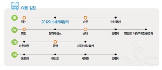 여수는 충무공이 지켜낸 바다의 중심축이 되는 곳으로, 첫째 날 여행은 2012여수세계박람회장에서 출발한다. 여수세계박람회장 관람을 통해 환경오염에 대처하는 세계인들의 지혜를 배우고 2050년 미래 바다의모습을 상상해 본다.
