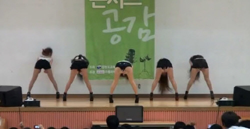 영상에는 축제의 공연팀으로 참가한 여성댄스그룹이 달라붙는 상의에 짧은 핫팬츠를 입고 나와 클럽룩으로 허리돌림과 튕김은 물론 사회적으로 논란이 됐던 현아의 버블춤 등 아찔한 댄스로 남학생들을 환호성에 빠지게 만들었다.