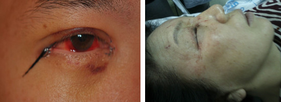 무차별 폭행 후 환자는 얼굴에 멍이 심하게 들고 눈이 부어 병원에 입원했다.