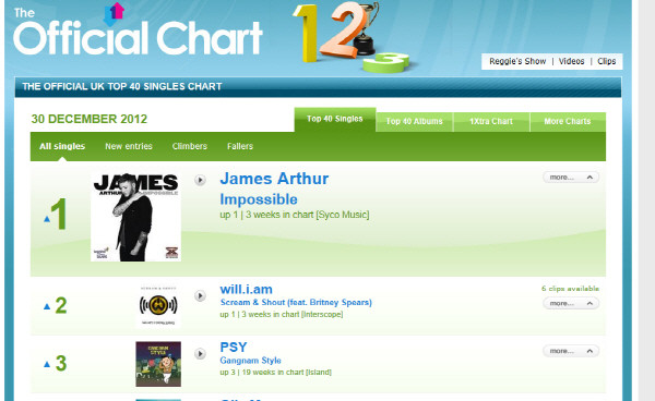 이번주 영국 싱글 차트는 3위에 오른 싸이를 비롯해 1위에는 영국 오디션 프로그램 '더 엑스펙터' 우승자 제임스 아서의 '임파서블'이 차지했고, 2위에는 윌.아이.엠과 브리트니 스피어스의 콜라보레이션 곡 '스크림&샤우트'가 올랐다.