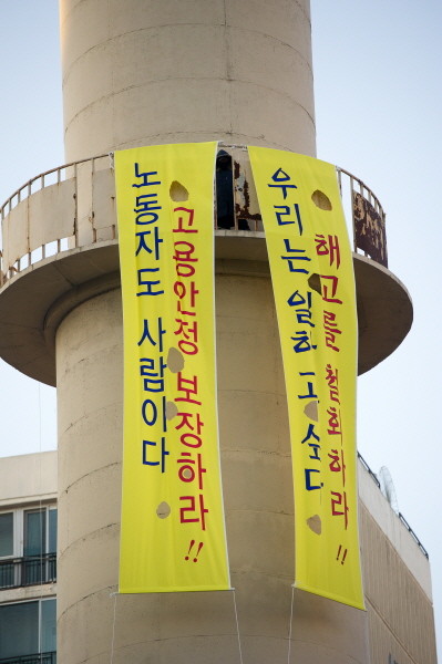 고공농성 중인 민 씨 등은 관리업체가 재고용을 하지 않기위해 사소한 이유 등으로 경위서를 요구했다며 부당 해고라고 주장했다.