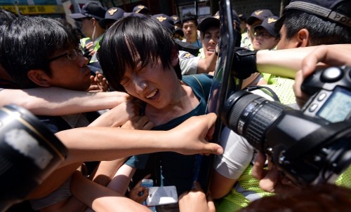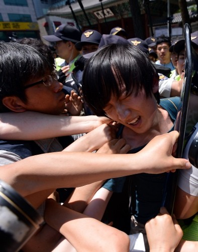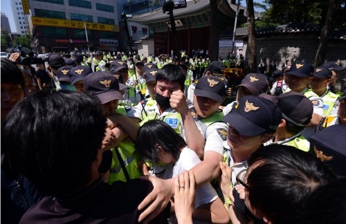10일 오전 서울 중구 덕수궁 대한문 앞에서 쌍용차 해고 노동자 분향소를 철거하는 구청 직원들과 쌍용차범대위 관계자들이 마찰을 빚었다.