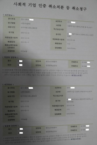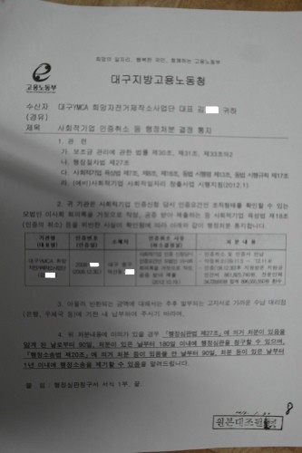 ▲ 대구YMCA사무총장 K씨가 노동부의 사회적 기업 인증취소처분을 취소해 달라는 행정심판을 청구(2012.12.18.)한 것이다. 이로 인해 노동부의 포장서훈 취소와 대구시의 지원금(1억 1,800만원)회수결정 및 사법처리결정이 취소처분행정심판 이후로 미뤄줬다. 하지만 비대위 확인결과 지난 3월 12일 사무총장 K씨가 청구한 행정심판이 기각된 걸로 확인됐다. 노동부와 대구시는 하루라도 빨리 행정심판에 따라 포장서훈을 취소하고 지원금(1억 1,300만원)을 회수하는 행정절차에 이어 사법처리를 진행해야 할 것이다.