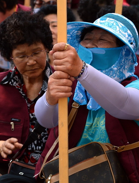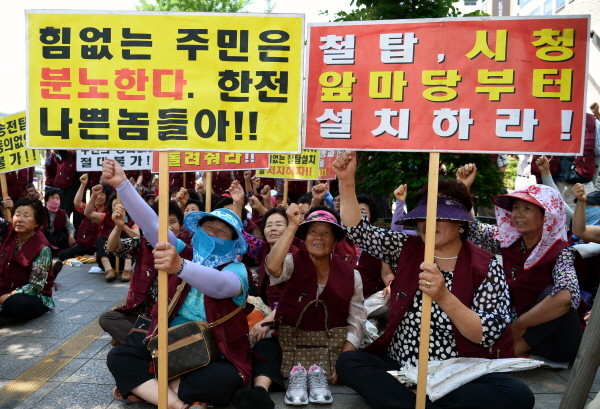 [일요주간=문경원 기자] 군산시 회현면, 옥구읍, 미성동 철탑반대 공동대책위원회 주민들이 지난 3일 오후 서울 여의도 국민은행 앞에서 집회를 열고 새만금 송전탑 경로 변경을 촉구했다.