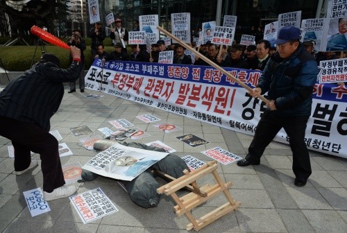 이들은 또 정 전 회장 얼굴사진을 붙인 인형을 막대기로 두들기는 퍼포먼스를 펼치기도 했다.