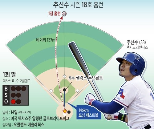 추신수의 방망이는 1회부터 뜨거웠다. 1회말 1사에서 상대 선발 좌완 펠릭스 두브론트의 초구 146㎞ 빠른 공을 강타해 가운데 담장을 훌쩍 넘기는 선제 솔로 홈런을 날렸다.