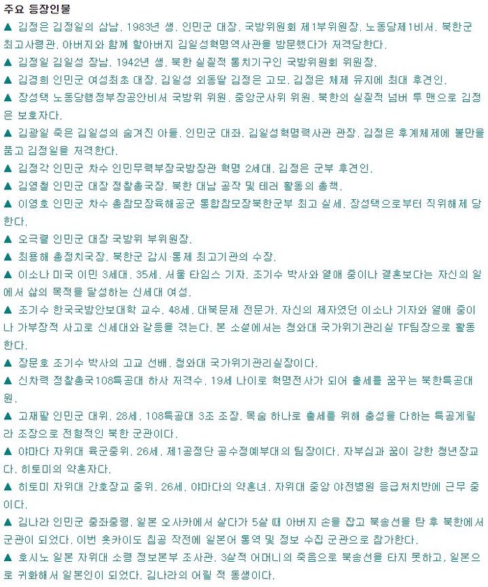 “야~ 야, 대장 동지, 이러문 아니 된다. 우리의 위대한 수령이자 네 할아버지는 일제 놈들과 항일무장투쟁을 통해 빼앗겼던 이 나라를 찾았고 네 아버지는 지금 산송장으로 이렇게 있지만 이 나라를 미제와 싸워 지키면서 대장 동지에게 물려주었단 말이지. 대장 동지는 공화국의 최고사령관으로서 이제 남조선과 미제를 제껴 버리고 통일을 해야지. 통일을…….”