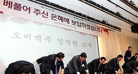 ▲ 오비맥주 김도훈 대표를 비롯한 주요 임직원들이 4일 서울 서초구 양재동 더케이호텔에서 열린 ‘어버이날 행사’에 참석한 주류 유통사 원로 대표들에게 큰절을 올리고 있다. ⓒNewsis
