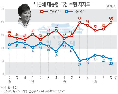 박 대통령의 지지율은 총선 직후인 4월 셋째 주 29%로 취임 후 취저치를 기록했다가 5주가 지난 이번 주까지도 30% 안팎에 머물고 있다.