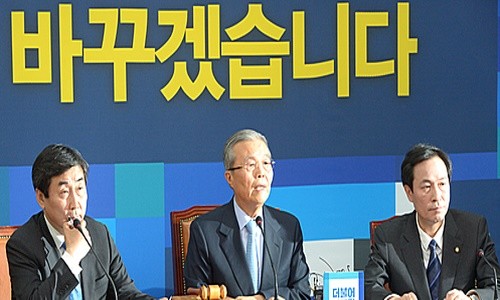 ▲ 더불어민주당 김종인 비상대책위원회 대표가 16일 오전 서울 여의도 국회에서 열린 비대위원회의에서 모두발언 하고 있다. 오른쪽부터 우상호 원내대표, 김종인 대표, 이종걸 원내대표. ⓒNewsis