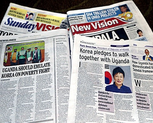 ▲ 우간다 현지 유력 언론들이 양국 수교 이후 대한민국 지도자로서는 첫 방문자인 박근혜 대통령의 국빈 방문에 대해 높은 관심을 갖고 보도에 나섰다. 영문 유력지 뉴비전 (25, 29일), 데일리모니터(28일) 등이 1면 머리기사, 기고문, 우간다 현지 새마을운동 특집 등을 통해 박 대통령의 국빈 방문의 의미, 일정을 다루면서 양국간 무역, 투자, 군사, 농업 및 ICT 등 다양한 협력 방안에 대한 기대감을 나타냈다. ⓒNewsis