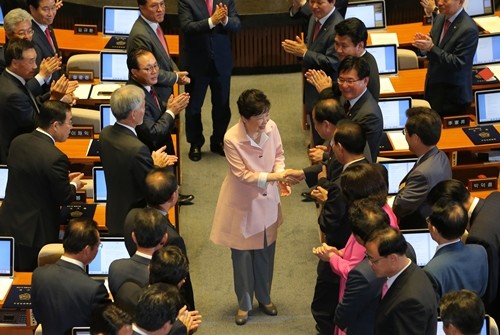 정진석 새누리당 원내대표는 본회의장에 입장한 박 대통령에게 허리 숙여 인사했다. 박 대통령이 입장하자 정 원내대표와 김무성 전 대표, 서청원 의원 등 새누리당 전원과 안철수 상임공동대표와 천정배 공동대표 등 국민의당은 전원 기립해 박수로 박 대통령을 환영했다.
